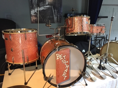 Dieses Set ist eine Berühmtheit und eine wahre Legende. Paul Betschart, Coiffeur aus Zürich Oerlikon, der "Artist of Hair" hat dieses Schlagzeug 1948 bei Eugen Giannini bestellt. Paul Betschart wollte sein Schlagzeug in einer Farbe, welche für das damalige Empfinden spektakulär war: Pink Sparkle. Eugen Giannini hat in diesen frühen Jahren jedes einzelne Detail selber hergstellt oder liess sich u.a. durch die Schlosserei Gautschi, welche ganz in Gianninis Nähe im Zürcher Niederdorf war, unterstützen. Für die Produktion des neuen Filmes von Regisseur Kurt Früh, in deren ein Schlagzeug eine wichtige Rolle spielen wird, waren die Requisiteure auf der Suche nach einem Schlagzeug, welches auch in einem schwarz/weiss Film gut wirken kann. Durch Eugen Giannni wurden sie an an Paul Betschart verwiesen, da dieser nach Ansicht von Giannini das absolut geeignete Schlagzeug besass. Nach anfänglichen Bedenken lieh Paul Betschart dann doch das Schlagzeug für diese Produktion aus. Somit wurde exakt dieses Set 1957 im Film "Bäckerei Zürrer" von Kurt Früh eingesetzt. In den 80er Jahren musste Betschart das legendäre Filmschlagzeug erneut ausleihen, diesmal für die Sendung Karussel des Schweizer Fernsehens in Anwesenheit von Eugen Giannini und Charly Antolini. Charly Antolini spielt zu Beginn der Sendung ein kleines Solo. Unter diesem Link ist die Sendung zu finden: (https://www.srf.ch/play/tv/karussell/video/eugen-giannini?id=8939e889-f32e-48cd-9aaf-de4677d9d3a3) Ich hatte das grosse Glück dieses berühmte Set direkt bei Paul Betschart kaufen zu können. Paul Betschart hat damals noch immer im Salon Mary in Oerlikon jeweils Samstags Haare geschnitten und Perücken hergstellt. Nach einen lustigen und unterhaltsamen Nachmittag hat sich Herr Betschart entschieden, mir dieses Set zu verkaufen. (Filmstills copyright Praesens Film)
