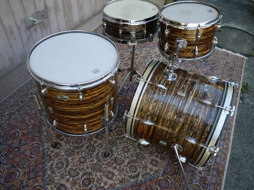 Eugen Giannini Set, mitte 60er Jahre. Ich besitze 2 Sets im selben braun-pearl finish, die abgebildete Snare gehört zum anderen, nicht abgebildeten Set. Diese Set wurde in einer Schule für den Musikunterricht verwendet. Dieses "Schicksal" haben viele Giannini-Schlagzeuge erleiden müssen. Glücklicherweise wurde dieses Set sehr behutsam behandelt, es befindet sich in einem praktisch neuwertigen Zustand.