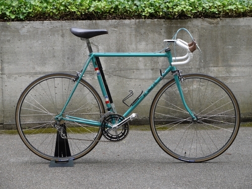 Pietro del Po aus den späten 70er Jahren. Seltene türkisgrüne Originallackierung, Dura Ace black Komponenten, inklusive Naben.
