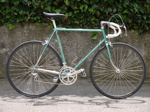 Sehr schön erhaltenes und rares Rossin Prestige. Originale, grün metallisierte Lackierung. (ähnlich Aston Martin) Aufgebaut mit einer NOS Dura Ace 7400 Gruppe.
